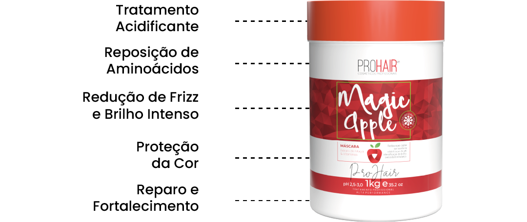 A linha Magic Apple é um tratamento acidificante rico em vitaminas, queratina e extrato de Maçã, as quais agem desde a cutícula ao interior da fibra capilar para uma melhor reposição de aminoácidos, doando brilho intenso às madeixas, reduzindo frizz e alinhando os fios.